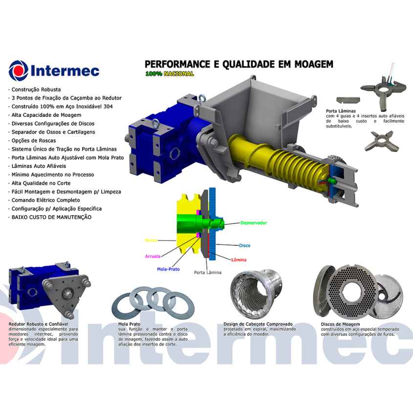 Os Moedores Intermec são projetados para alto volume de moagem, sendo extremamente robustos e eficientes na sua proposta. Eles processam diversos tipos de alimentos frescos ou congelados como: carne bovina, aves, suínos e subprodutos de animais. Para moagem grosseira e moagem final.