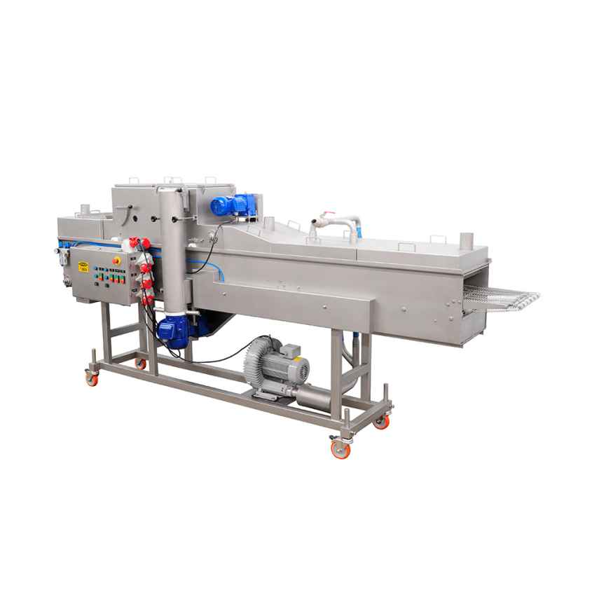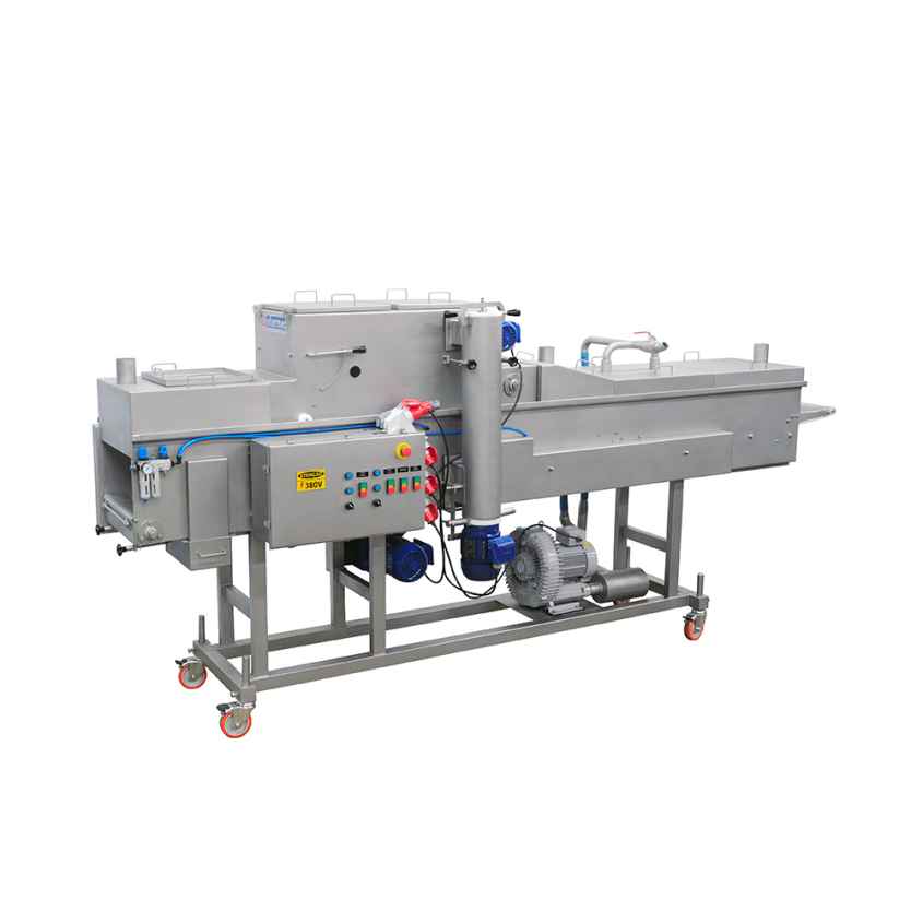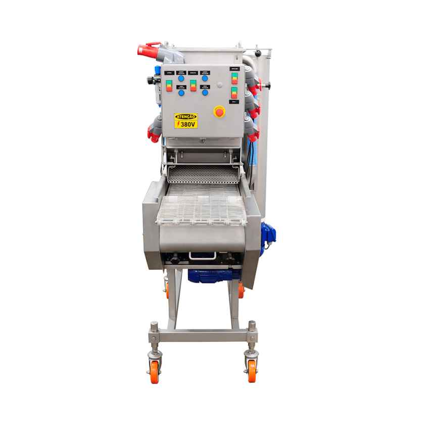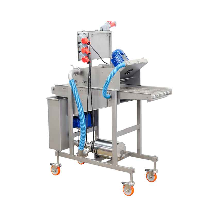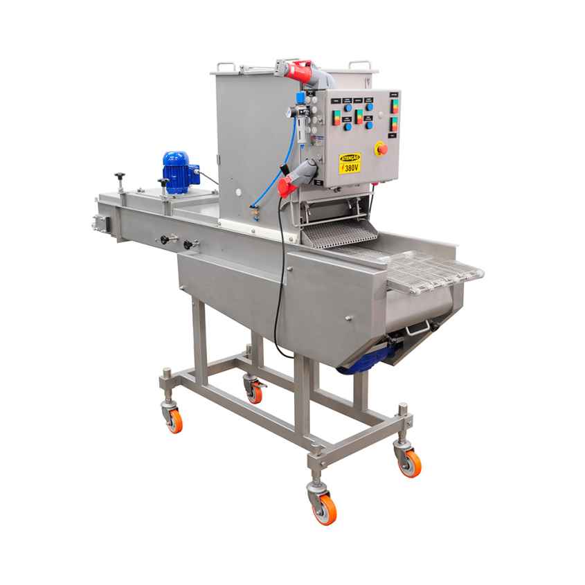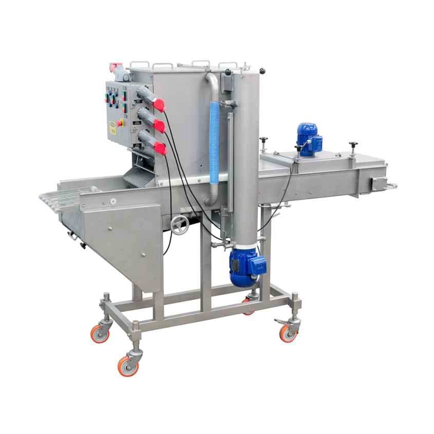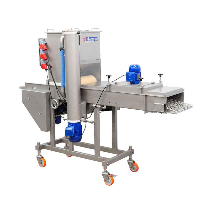 A Batter Intermec proporciona uma cobertura eficiente com uma imersão em conjunto com 4 cortinas de Glacê sobre o produto. Reposicionando a cortina de Glacê, o processo pode ser aperfeiçoado para atender o público e dar mais aderência ao empanado. Ao controlar o fluxo de massa, a espessura da camada pode ser ajustada. O fornecimento e distribuição de ar, também pode ser ajustado; tanto para o soprador superior quanto para o inferior. Regulagens de Altura, Ângulo e Volume de ar garantem uma cobertura completa e uniforme do produto. Quando os produtos saem da máquina, todo excesso de Glacê é assoprado e retornado ao tanque para reutilização. A Batter Intermec é muito eficaz na aplicação, tanto ao iniciar quanto para mudança de Glacê.